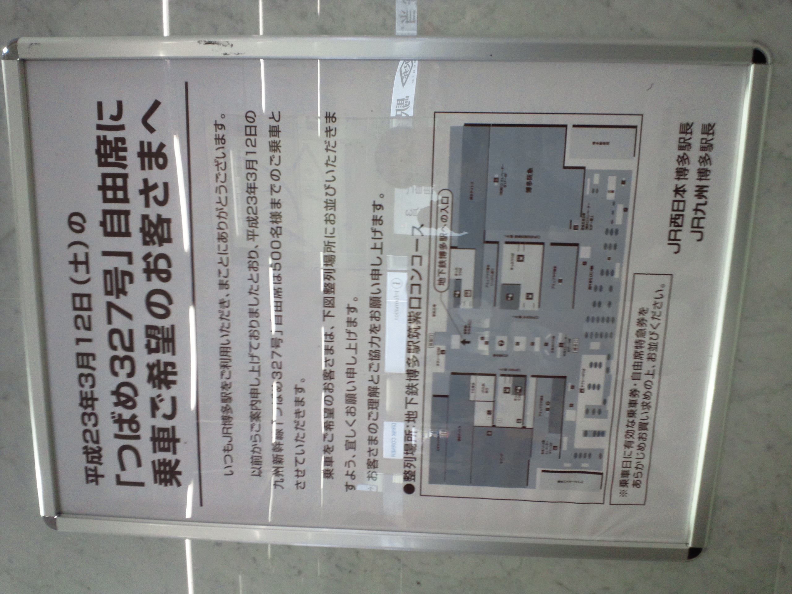 右は翌日の九州新幹線全線開業一番列車「つばめ327号」自由席に乗車を希望するお客さん向けの案内ポスターでした。左の運転見合わせ案内の下にも同じものが書かれた紙が入っていました。