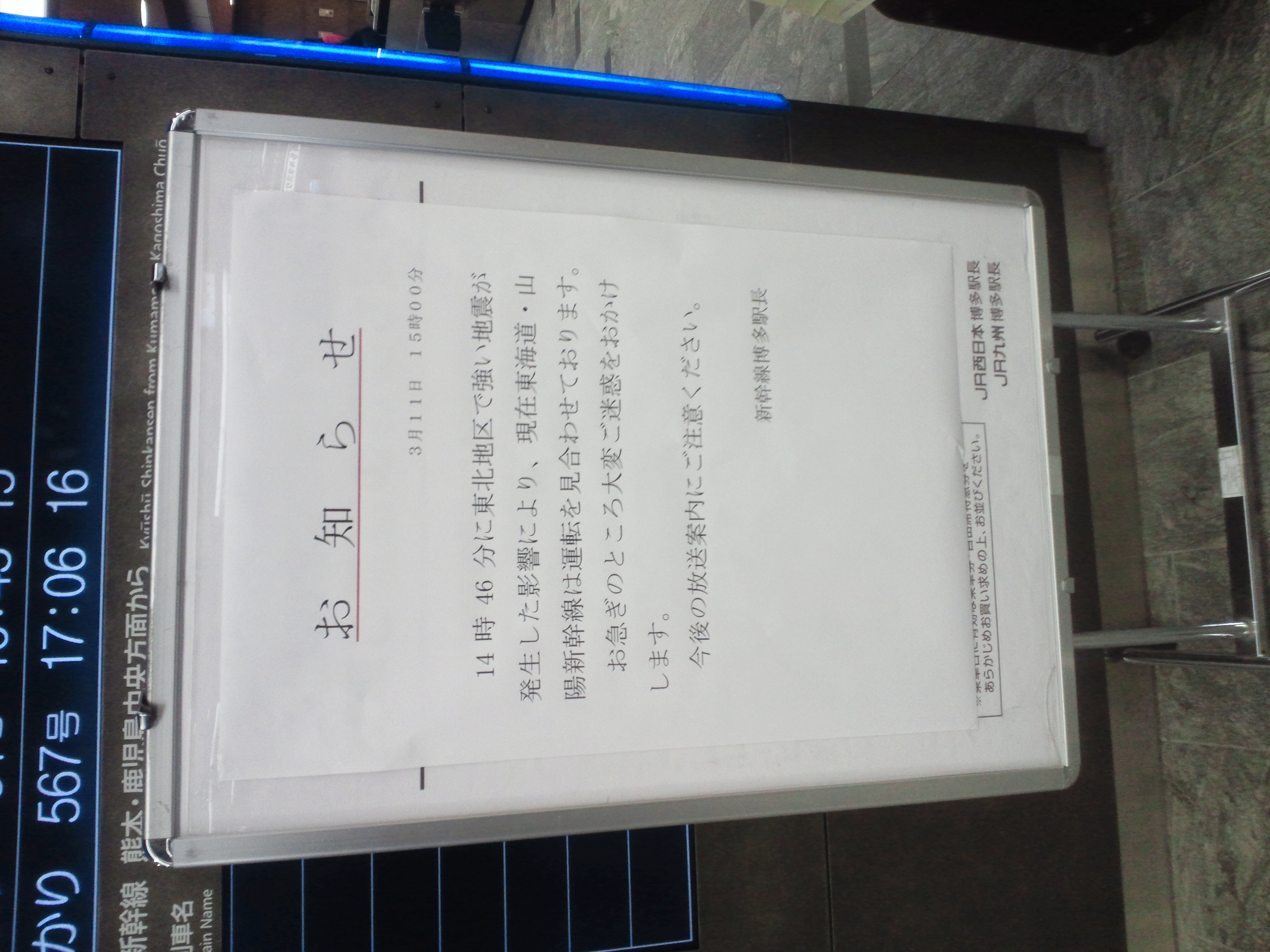 左は新幹線博多駅の改札口前に掲示されていた案内です。「14時46分に東北地区で強い地震が発生した影響により、現在東海道・山陽新幹線は運転を見合わせております」という、通常ならつながるはずのない地名がひとつながりの文に出てくる信じがたい文言が書かれていました。